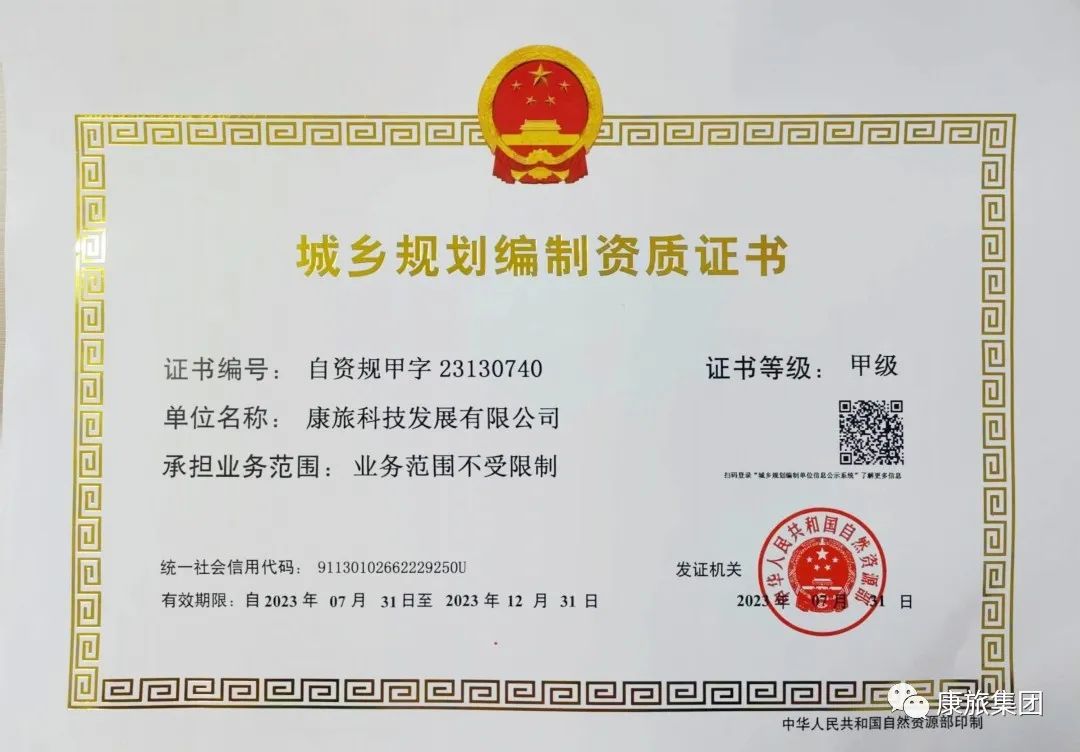 克日,经天然资本部检查核准,康旅控投小团体公司的旗下康旅科技创新的成长不断公司的(康旅物权专题讨论院)新农村规划体例天赋取得胜利进级为甲级!